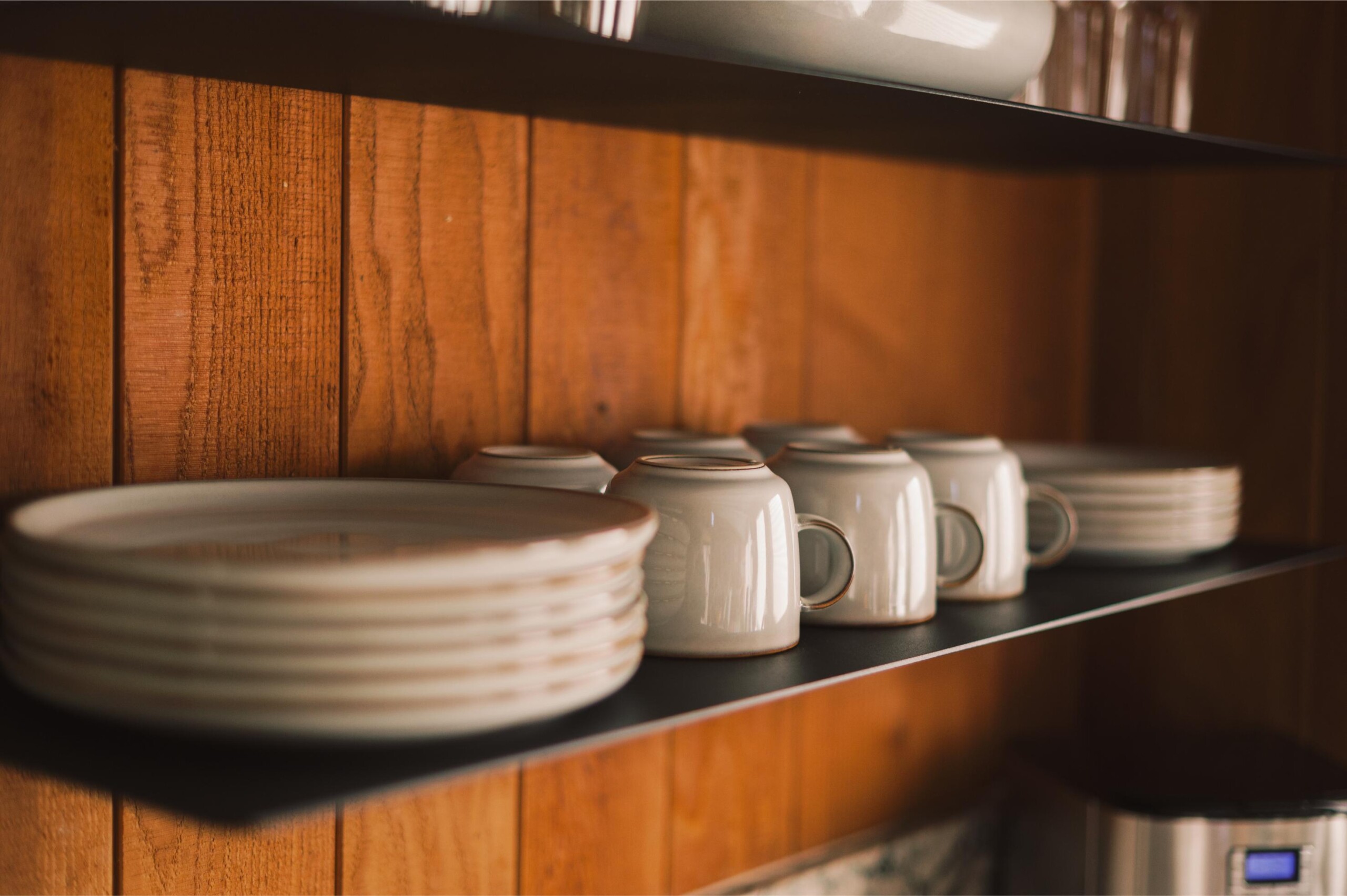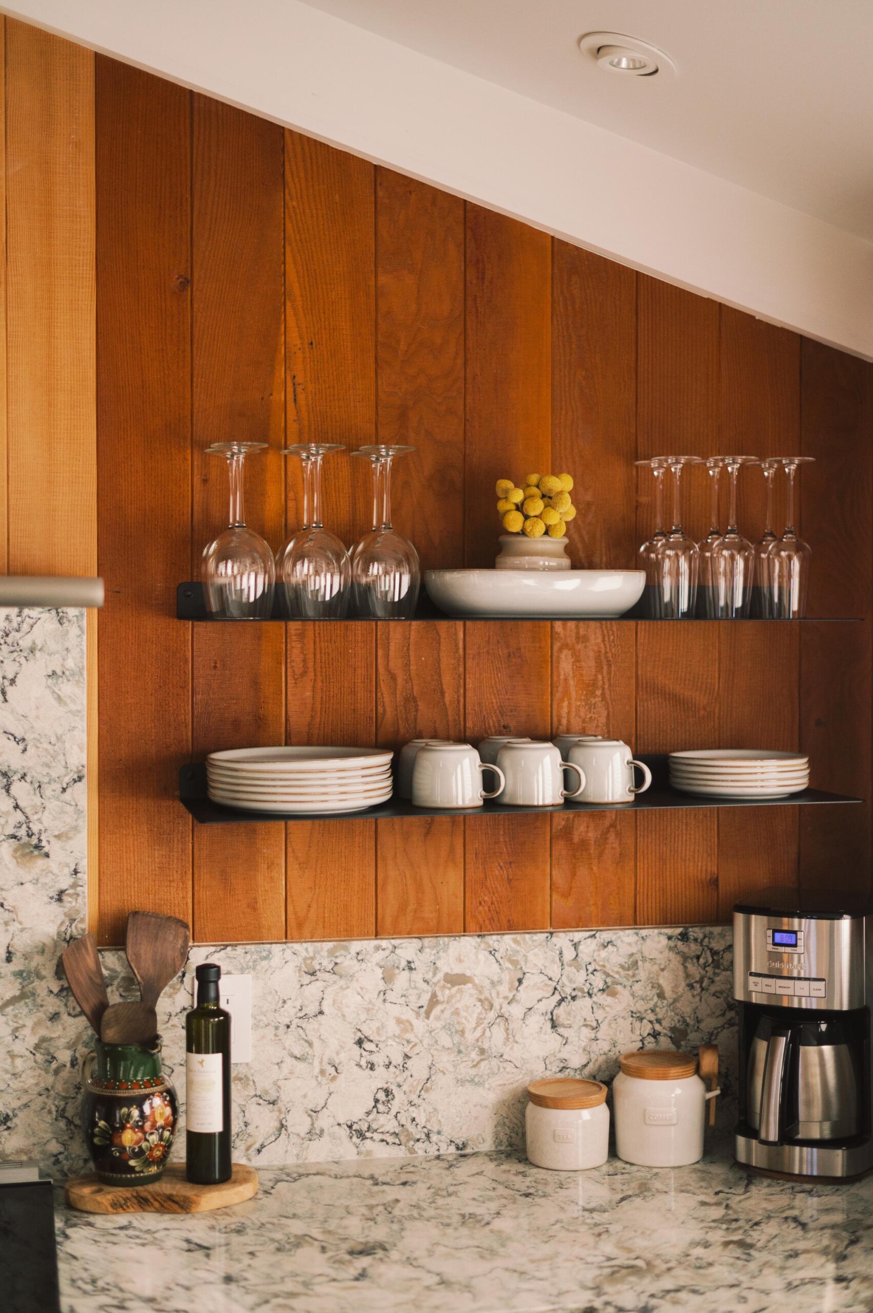 The fully stocked kitchen includes All-Clad cookware, spices, oils, and servingware for six. Whether you’re preparing a simple breakfast or a sunset dinner, everything you need is at your fingertips.
